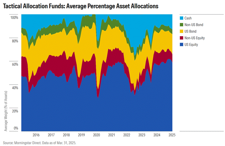 W 2019 roku rozpoczynając działanie InvesThink, opublikowaliśmy szeroki materiał napisany przez Jarosława Przybyła, Macieja Pietraszkiewicza i Pawła Chylewskiego pokazujący, że przysłowiowy timing rynkowy w zarządzaniu majątkiem się nie sprawdza (Timing rynkowy – InvesThink). Tezy tam zawarte pozostają nadal aktualne, a bardzo interesującym rozwinięciem tej publikacji jest artykuł Jefferey Ptak z Morningstar: „These Fund Managers Could’ve Gone Fishin’ and Earned Double the Return”, Morningstar, 15.04.2025. Autor badał skuteczność funduszy aktywnej alokacji w USA, czyli takich funduszy, które w zależności od zapatrywań zarządzającego odnośnie do rozwoju sytuacji rynkowej mocno „wachlują” portfelem. Raz mają więcej akcji, bo uważają, że to akurat czas na akcje, innym razem więcej obligacji, mocno przeważają jeden rynek, a później inny itd. Okazuje się jednak, że skuteczność tego typu strategii jest przynajmniej rozczarowująca. Poniżej najważniejszy wykres artykułu: