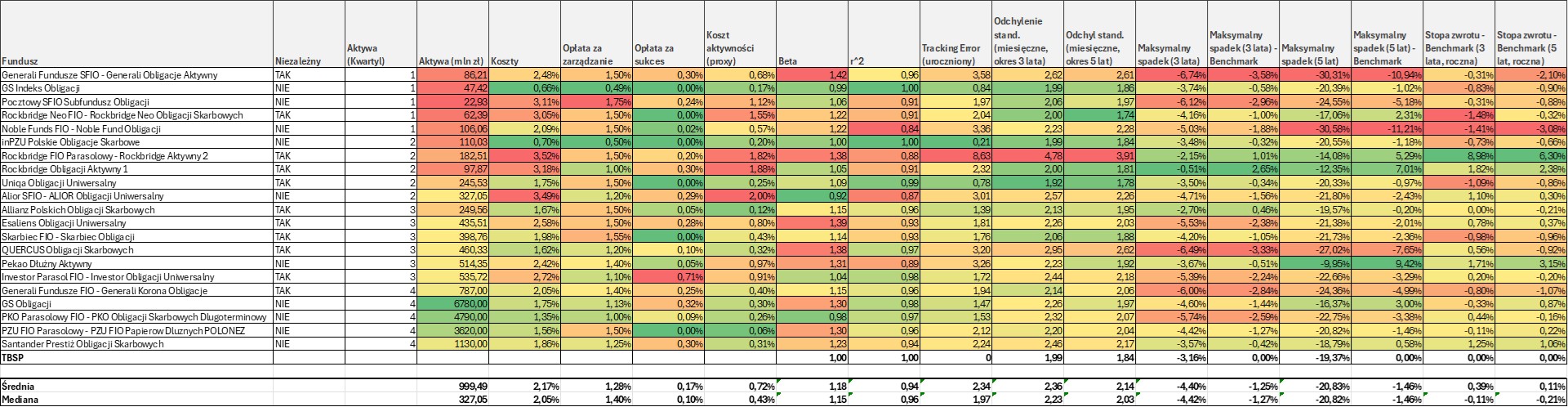 Poniższy wykres prezentuje szereg parametrów analizowanych przez nas funduszy bankowych/ubezpieczeniowych (Alior, Goldman Sachs, Noble, Pocztowy, PZU, PEKAO, PKO, Santander) oraz niezależnych (Allianz, Esaliens, Generali, Investor, Quercus, Rockbridge, Skarbiec, Uniqa).