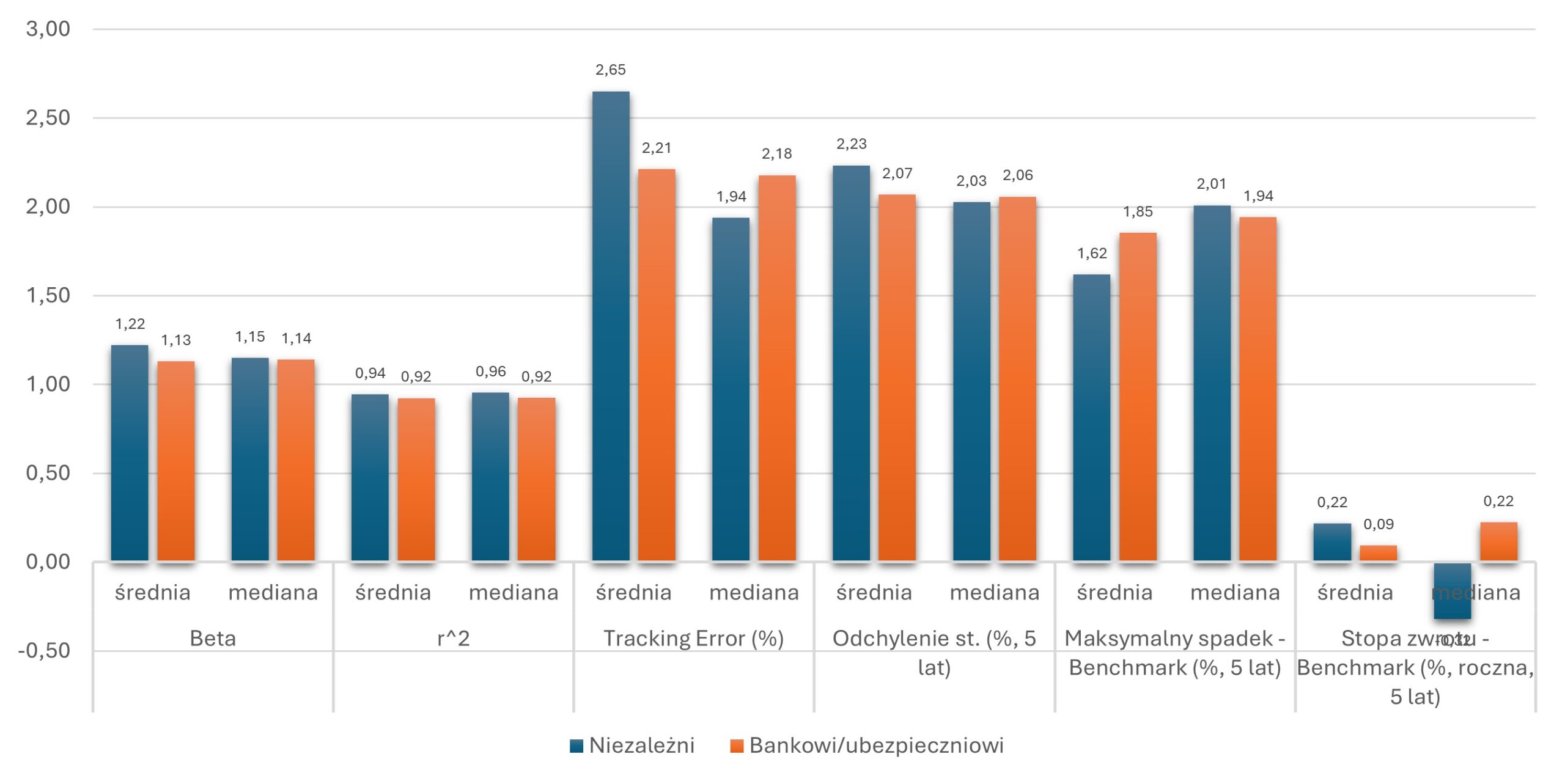 Tabela 2. Średnia i mediana tracking error dla funduszy o kosztach poniżej 2% i powyżej 2%