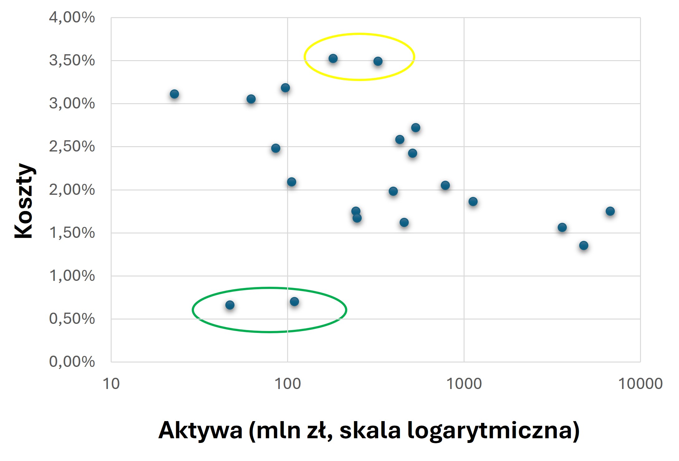 Fundusze inwestycyjne posiadają pewne koszty stałe, które wraz ze wzrostem aktywów procentowo, do wielkości aktywów spadają. Są to np. koszty audytu, depozytariusza, sprawozdawczość czy obsługi księgowej. Fundusze o niskich aktywach, o ile TFI nie zdecyduje się subsydiować kosztów stałych lub obniżyć innych opłat (np. opłaty za zarządzanie), mają z reguły wyższe koszty niż fundusze o większych aktywach. Poniższy wykres pokazuje zależność między kosztami a wielkością aktywów. Z powodu dużej rozpiętości aktywów (od 23 mln zł do 6,8 mld zł) wykorzystano skalę logarytmiczną. Zieloną pętlą zaznaczono fundusze pasywne Goldman Sachs Indeks Obligacji oraz InPZU Polskie Obligacje Skarbowe, które z założenia mają niskie koszty, więc nie będzie tutaj szczególnie widać zależności kosztów od poziomu aktywów.