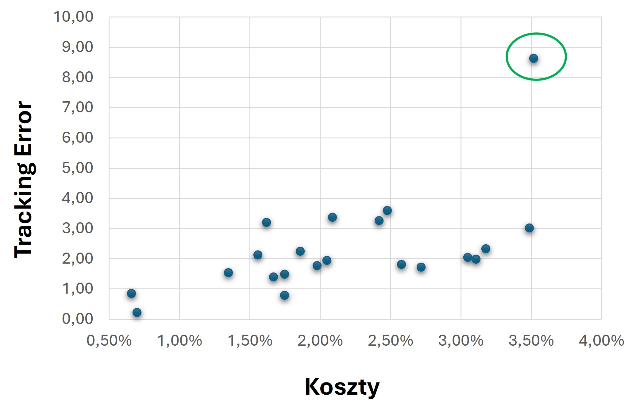 Mamy zatem dwa częste powody wyższych kosztów funduszy: niskie aktywa i wysokie procentowo koszty stałe oraz aktywność zarządzających. Jak to wpływa na zachowanie funduszu vs benchmark, czyli tracking error? Zgodnie z naszym założeniem, fundusze o wyższych kosztach powinny mieć tendencję do wyższego tracking error, czyli też często i do większego ryzyka.