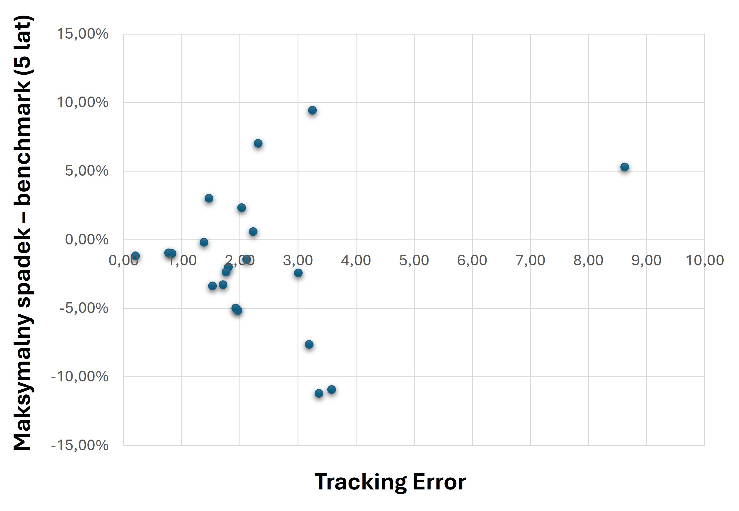 Nie zawsze większa zmienność funduszu przekładała się na większe, maksymalne spadki vs benchmark, ale im większy tracking error, tym większa rozpiętość pozytywnych i negatywnych wyników, co prezentuje poniższy wykres. Na poniższym wykresie, jeżeli wartość jest dodatnia, wycena funduszu spadła mniej niż benchmark (np. 5%, oznacza, że maksymalny spadek wyceny funduszy był o 5 punktów procentowych niższy, niż spadek benchmarku). Jeżeli wartość jest ujemna, wycena funduszu spadła bardziej niż benchmark (np. -5%, oznacza, że maksymalny spadek wyceny funduszu było o 5 punktów procentowych większy niż spadek benchmarku)