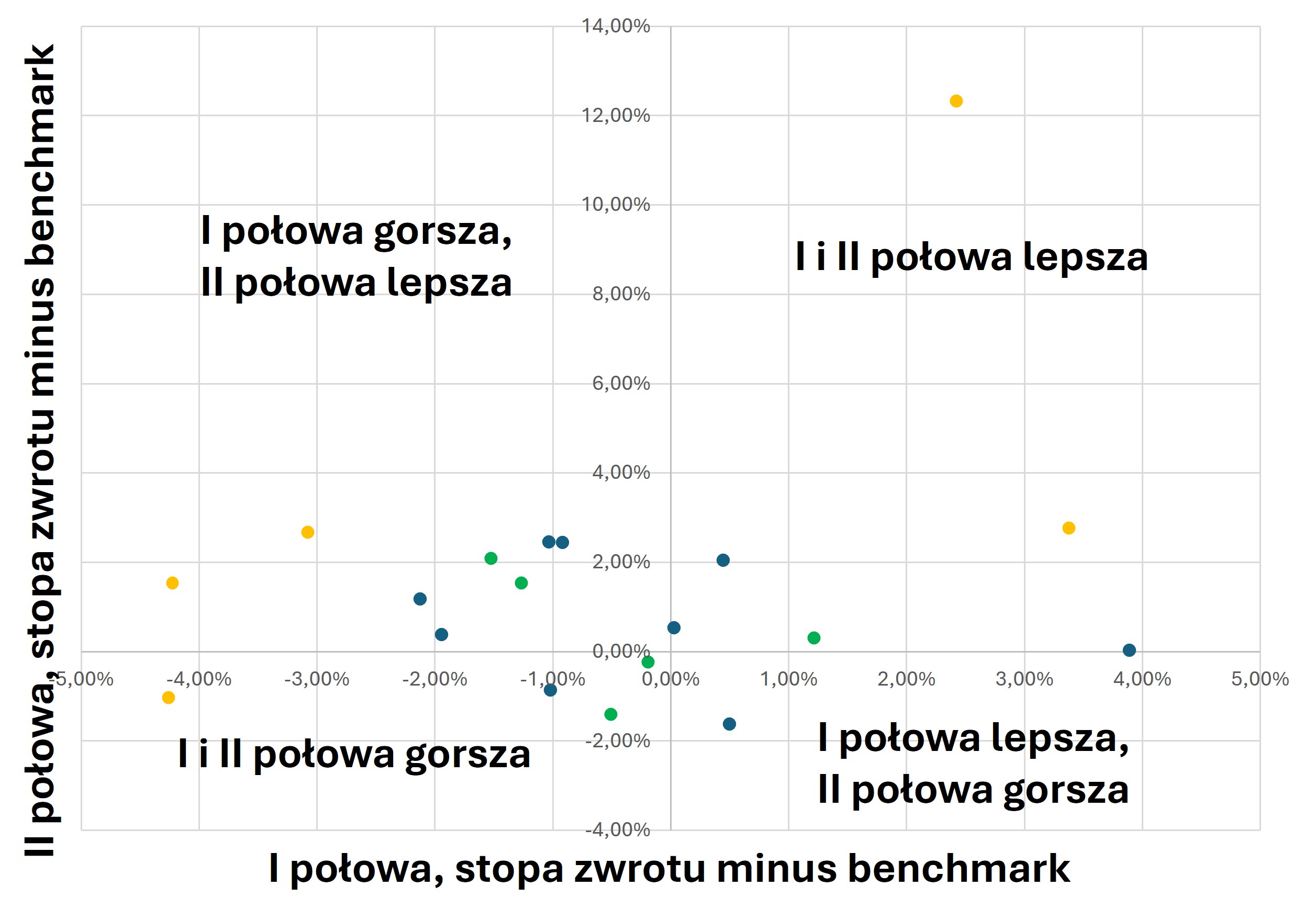 Pierwsza połowa analizowanego okresu była trudna dla funduszy obligacji: tylko 7 z 19 wygenerowało stopę zwrotu wyższą niż benchmark. Z tych, które wygenerowały pozytywne stopy zwrotu zaledwie jeden wygenerował gorszą niż benchmark stopę zwrotu w drugiej połowie okresu. Z12 funduszy, które wygenerowały ujemną stopę zwrotu vs benchmark w pierwszej połowie roku, 8 wygenerowało pozytywną stopę zwrotu w 2 połowie okresu. W sumie 14 funduszy wygenerowało w 2 połowie okresu wyższą niż benchmark stopę zwrotu. 4 fundusze wygenerowało ujemne stopy zwrotu w dwóch połowach. Nie widać jakiegoś szczególnego efektu powrotu do średniej, raczej brak zależności między okresami[19]. Dobre/słabe zachowanie funduszu w jednym okresie, nie oznacza, że fundusz będzie dobry lub słaby w kolejnym. Przeszłych stóp zwrotu nie należy zatem w prosty sposób przekładać na przyszłe stopy zwrotu.