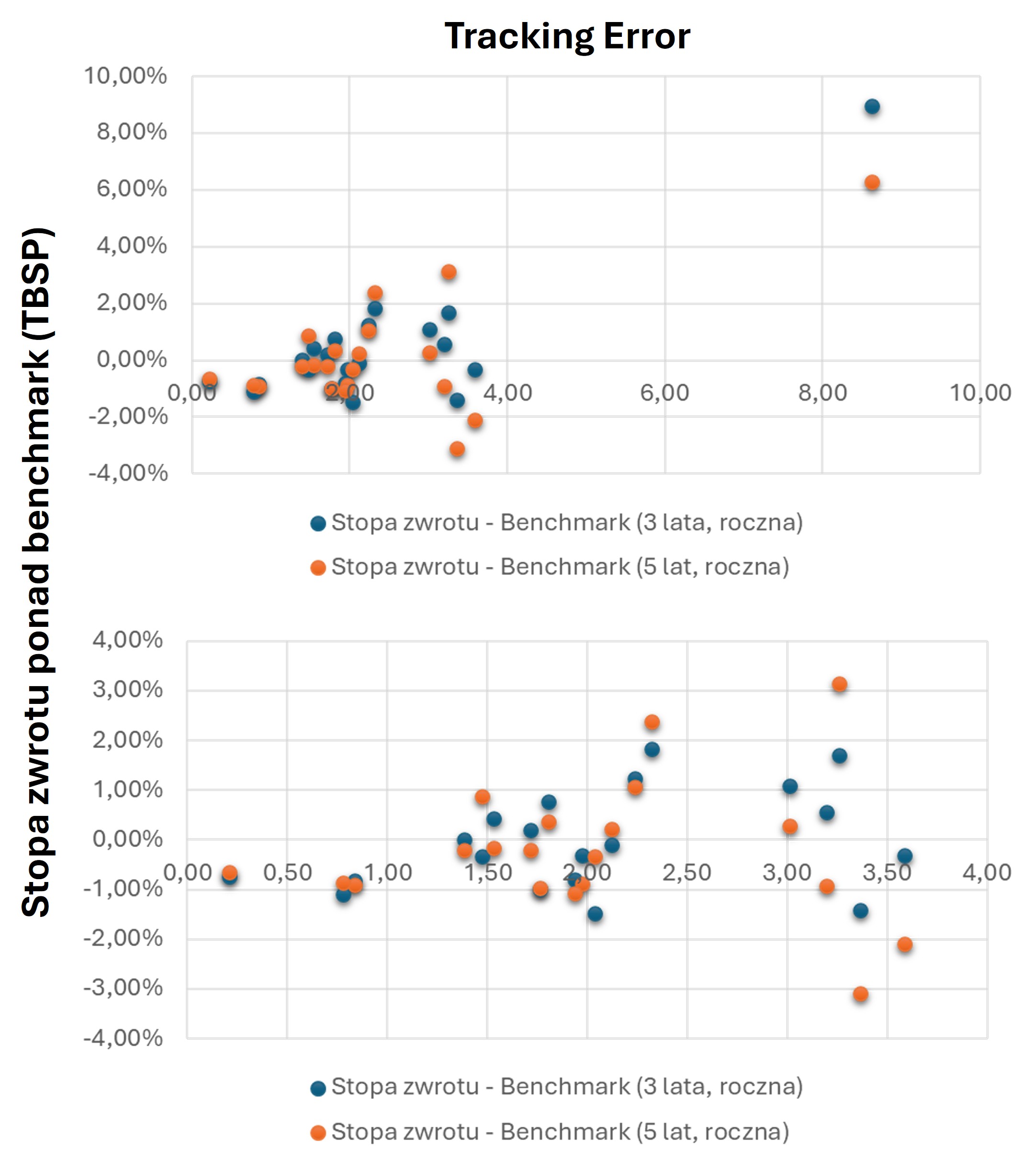 Reasumując, nie ma zależności pomiędzy wyższym tracking error a wyższymi stopami zwrotu. Fundusze z wyższym tracking error miały po prostu większą dyspersję stóp zwrotu vs benchmark: czasami znajdowały się powyżej benchmarku, czasami poniżej ale z reguły im wyższy tracking error tym większe odchylenia w jedną lub drugą stronę. Fundusze z wysokim tracking error mogą być zatem zarówno wielkimi zwycięzcami, jak i wielkimi przegranymi rynkowej walki w danym okresie. Nie widać było również zależności między stopami zwrotu w jednym okresie, a stopami zwrotu w kolejnym. Nie powinno się zatem wyciągać wniosków dotyczących przyszłych stóp zwrotu vs benchmark, czy inne fundusze bazując na przeszłych stopach zwrotu.