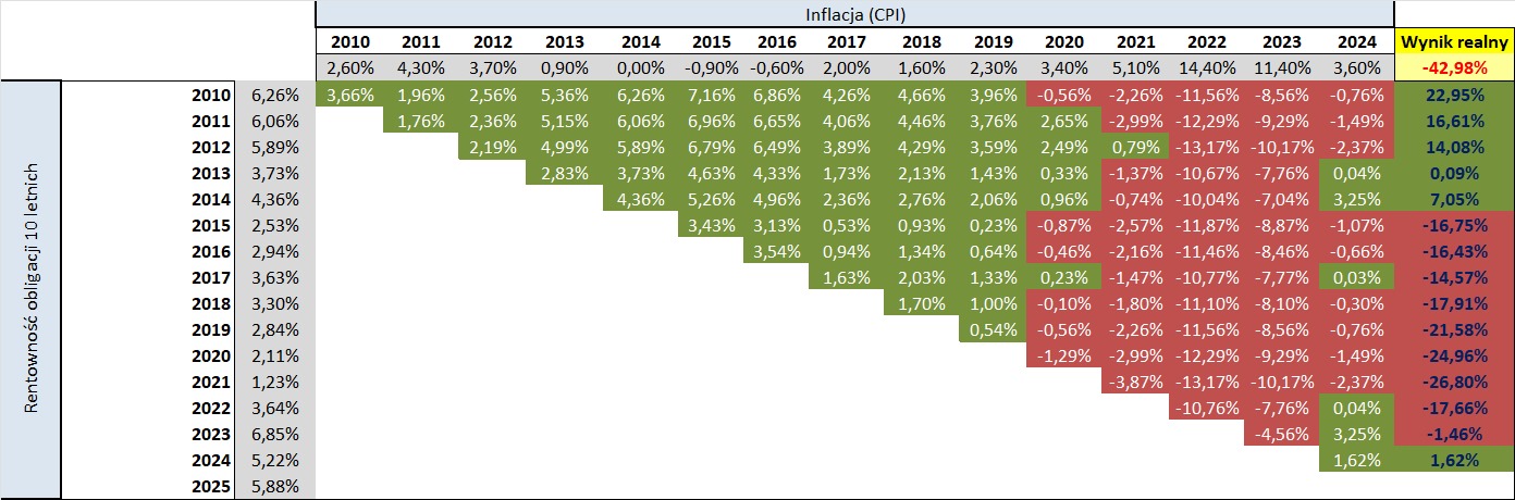 W tabeli nr 1 zebrałem rentowności, z którymi weszliśmy w dany rok, kupując obligację dziesięcioletnią ostatniego dnia poprzedniego roku. Te kupowane w latach 2010-2014 zapadły nam w międzyczasie, więc przyjąłem, że zostały kupione nowe serie 10 letnich „skarbówek”. Dla każdej z kolumn mamy pokazaną inflację w danym roku(CPI, najczęściej używana). Na żółto zaś pokazałem, ile wynosi wartość nabywcza, a więc realna wartość pieniędzy po okresie 10 lat uwzględniając wzrost cen. Spadek to prawie 43%. Ostatnia kolumna to wynik realny (czyli oprocentowanie pomniejszone o inflację przy uproszczonym założenie ponownego inwestowania odsetek w obligacje) na koniec 2024 roku.